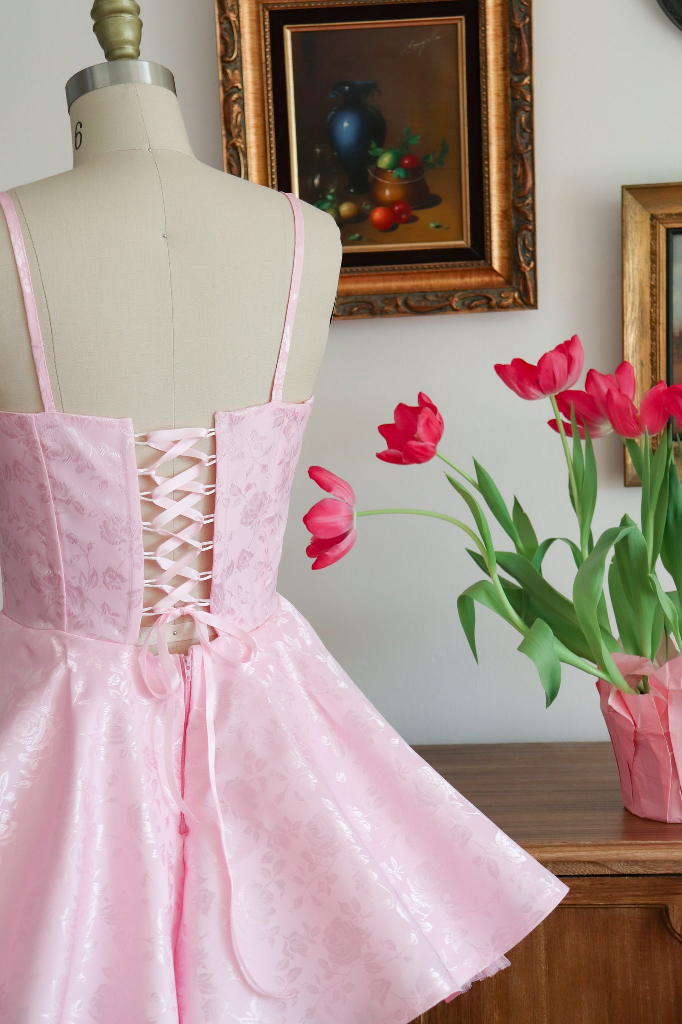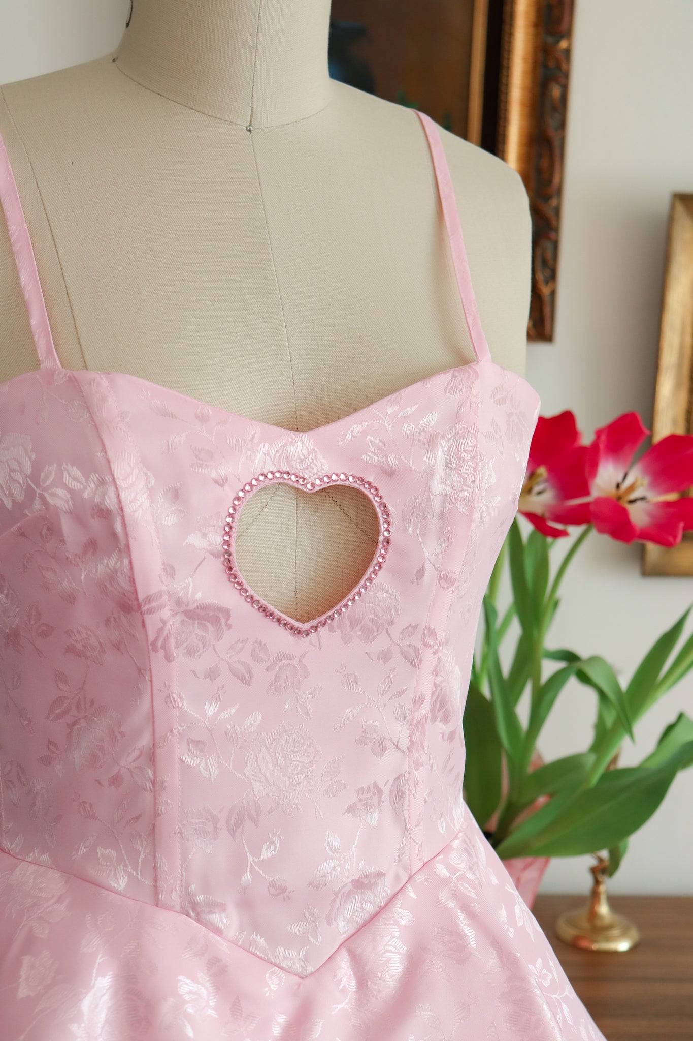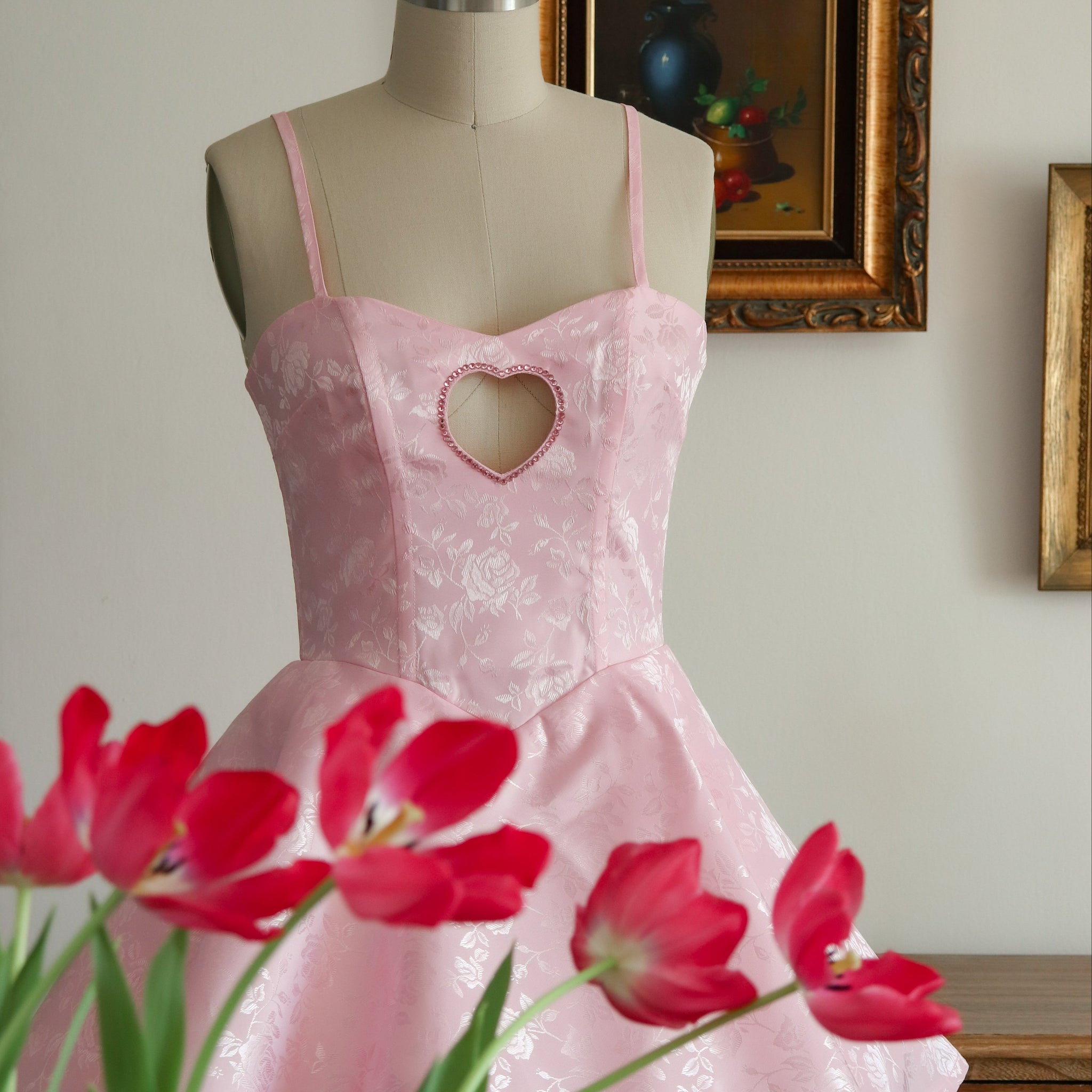 This pastel pink floral jacquard dress is the ultimate romantic statement piece, inspired by pop-princess Sabrina Carpenter. Designed with a sweetheart neckline and a structured corset bodice featuring internal boning, this dress offers beautiful shaping and support.